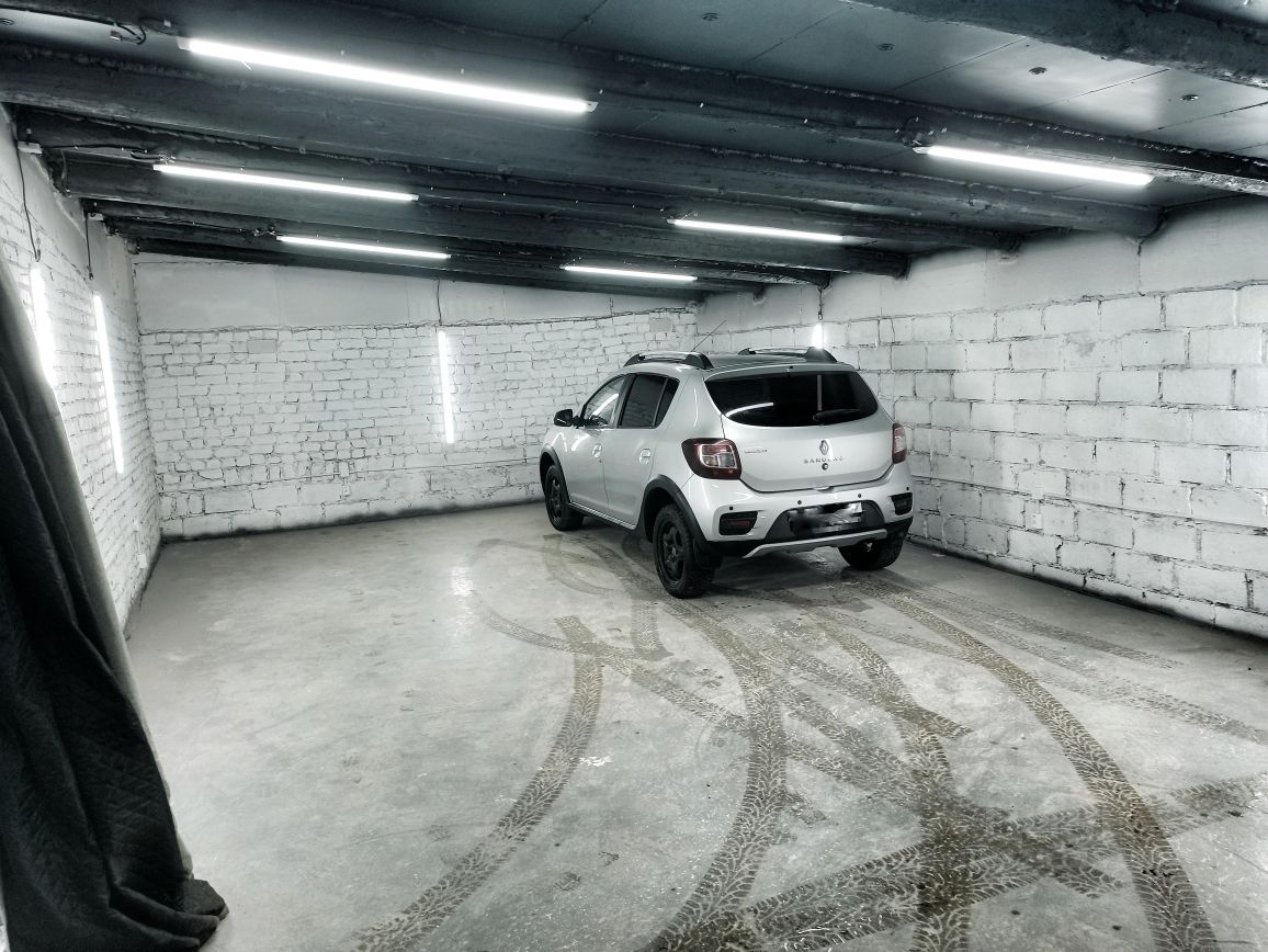 Длина гаража 10,2м ширина 5,55м. Спокойно вмещается 3 автомобиля, при желании можно и 4