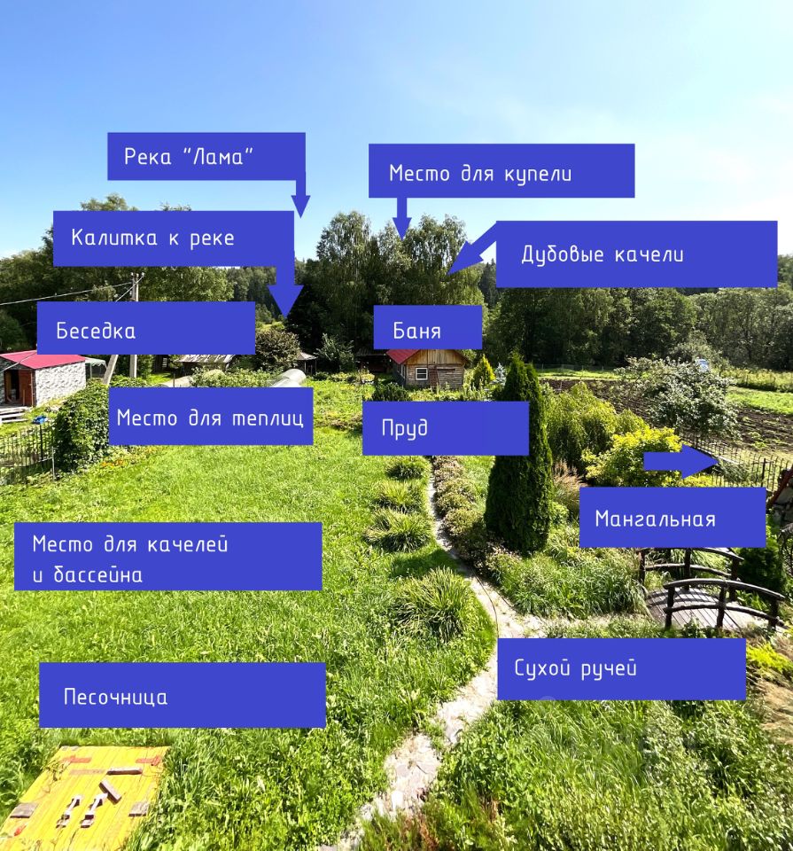 Отдельно построена баня (свой септик (экосептик)), также есть зона для организации купели к бане. Установлены гигантские дубовые качели.